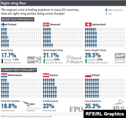 In some cases, those gains by nationalists and right-wing parties have been borne out by elections. This month saw the anti-immigration Swiss People's Party win nearly 30 percent of the vote in parliamentary elections on October 18 dominated by debate of migration issues. Austria's Freedom Party, which has campaigned on an "anti-immigration" and "anti-Islamization" platform for years, won over 30 percent of the vote in both October's mayoral race in Vienna and September's regional elections in Upper Austria, the country's industrial heartland.