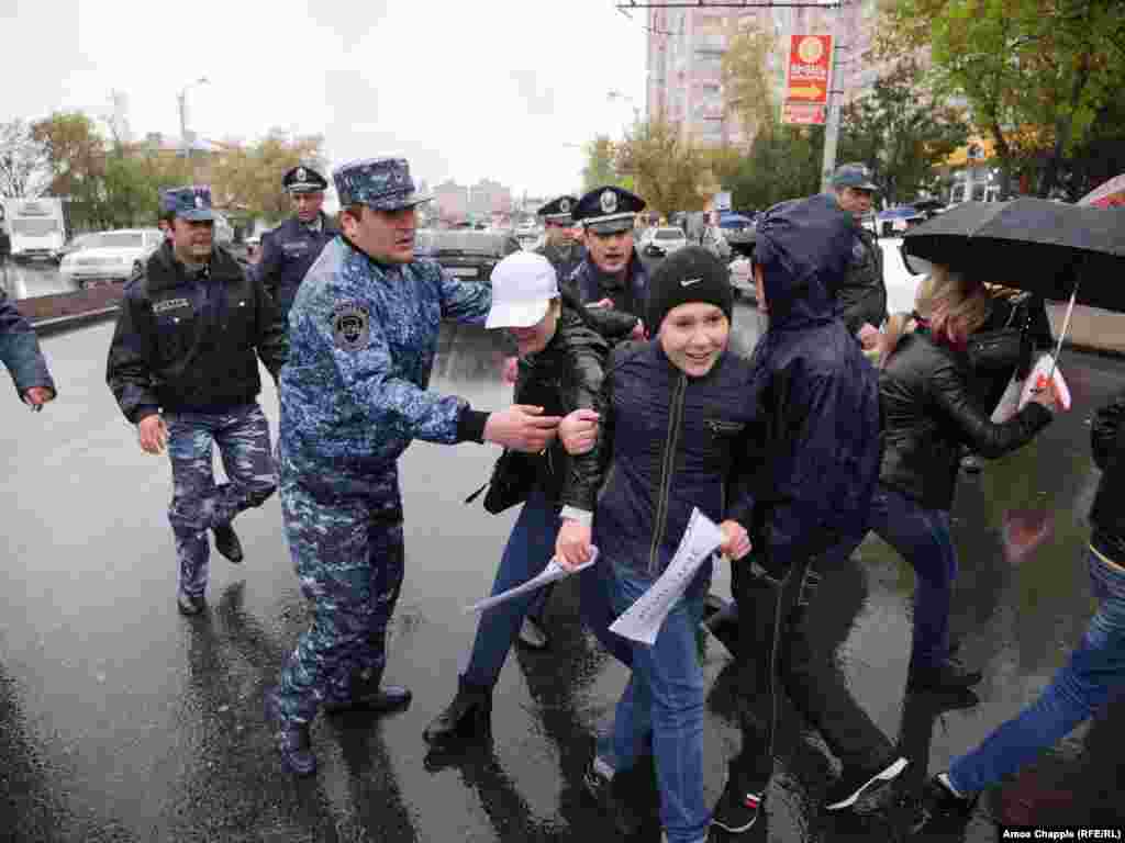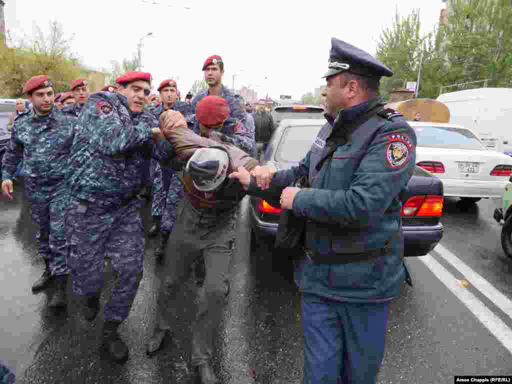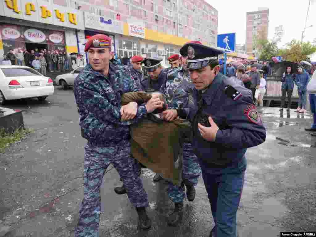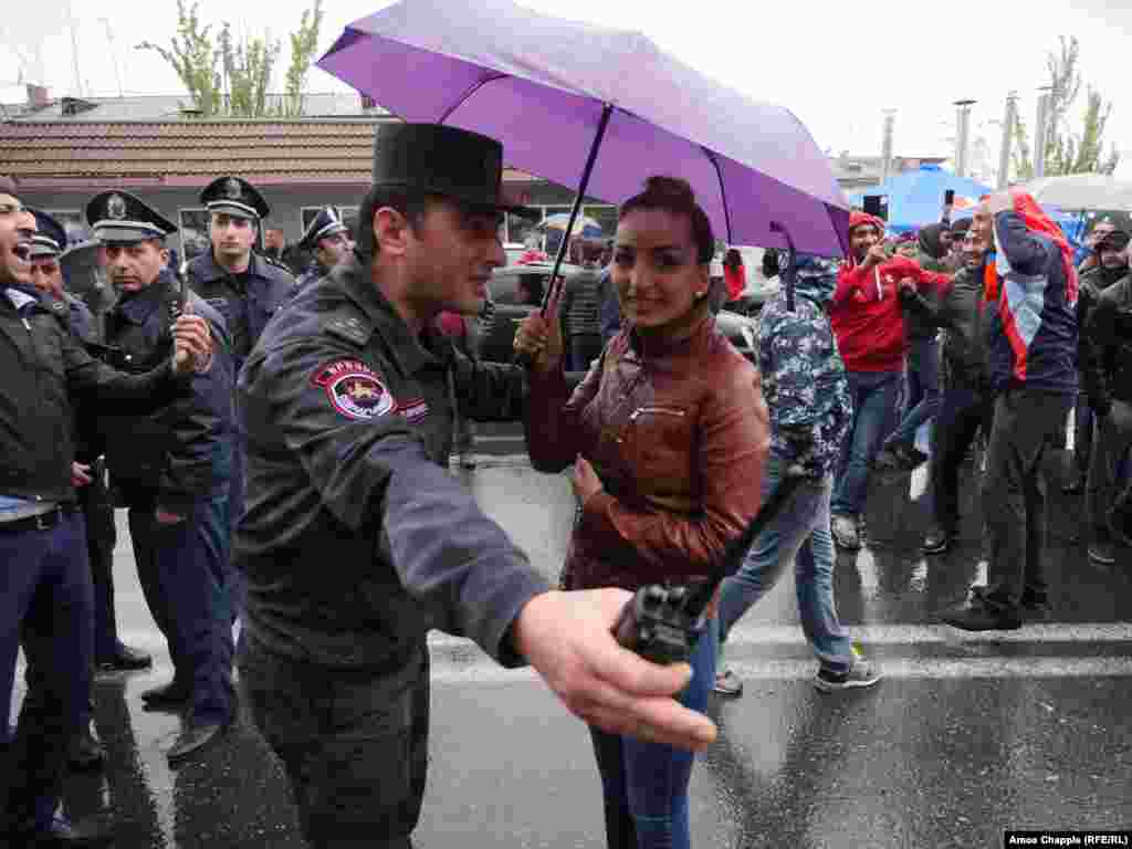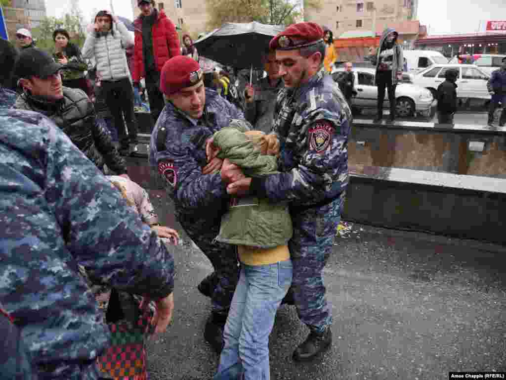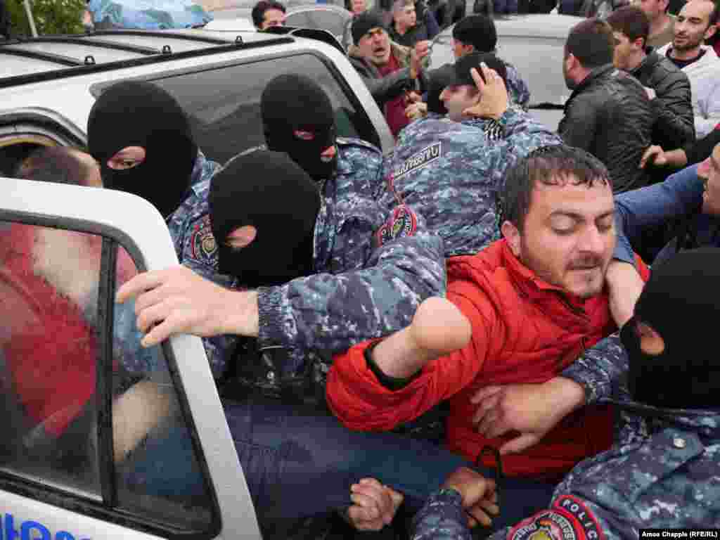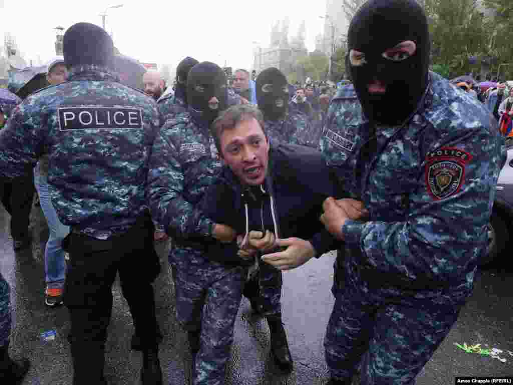 On the ninth day of demonstrations in Yerevan on April 21, Armenian protesters confronted police and police detained more protesters in a cold and rainy capital. The demonstrators oppose a restructuring of the country’s governing system that has enabled Serzh Sarkisian -- the newly appointed prime minister -- to stay in power after his 10-year stint as president ended two weeks ago.