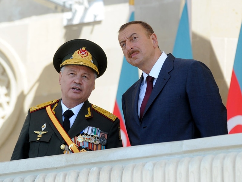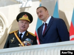 Azerbaijani Defense Minister Safar Abiyev and President Ilham Aliyev view the military parade in Baku at the weekend.