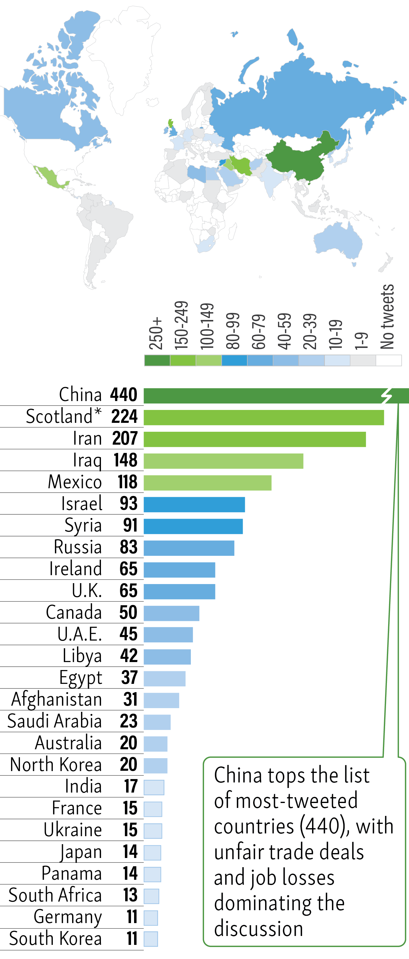 U.S. President-elect Donald Trump has tweeted about 74 foreign countries since joining Twitter. How many times has he tweeted about your country?