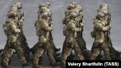 Medals jangling, Azerbaijani soldiers march in formation. Thousands of people, military and civilian, were killed on both sides of the conflict.