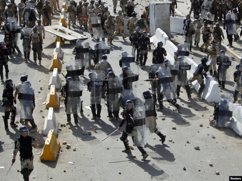 Iraqi riot police shield themselves as protesters pelt them with stones during a demonstration in central Baghdad on February 25.