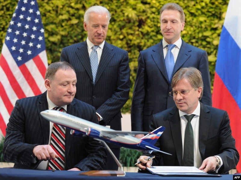 Biden (top left) and Russian First Deputy Prime Minister Igor Shuvalov (top right) look at Sergei Kravchenko (left), director of Boeing Russia, and the CEO of Aeroflot Vitaly Saveliev (right) as they sign the contract.