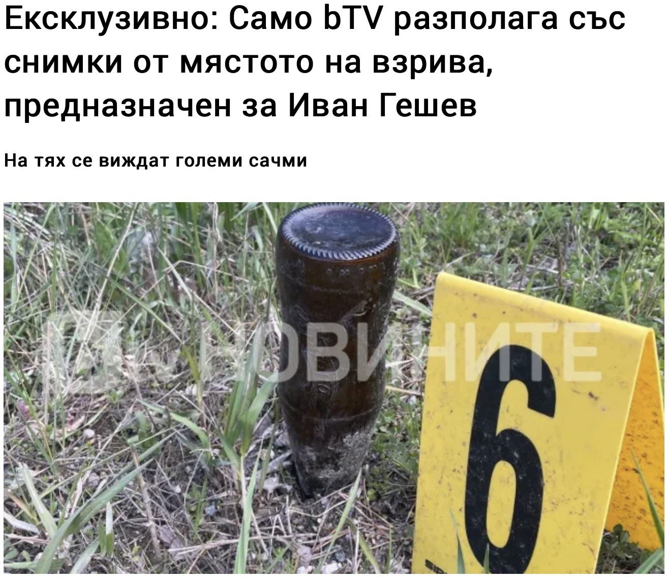 Underwhelming images appeared to belie Sarafov's assertion that the blast caused a 4-to-5-meter-high "column of fire" that tore out a "crater" that was 30-40 centimeters deep and nearly 3 meters wide. A close-up of a headlight said to be from Geshev's armored vehicle purported to show minor damage from a bullet or shrapnel. And Sarafov said the detonation involved "no less" than the equivalent of 3 kilograms of TNT, although a week later there was still no official identification of the explosive or quantity.