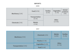 In 2017, Russia imported a larger share of machines, cars, and vehicle parts. On the other hand, the import of most agricultural products, such as sugar or wheat, has been on the decline.