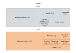 The share of Russia's export of mineral products has increased from 51 to 58 percent, while the export of metals has decreased from 19 to 12 percent. The export of agricultural products -- such as wheat and barley -- has been on the rise.