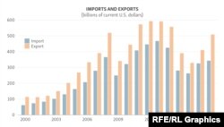 Russia's imports and exports grew steadily after Putin became president but experienced two significant drops: one in 2009 following the global financial crisis and the Russia-Georgia war and another one in 2015 after Russia forcibly annexed Crimea a year earlier and faced harsh economic sanctions by the West.