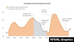 Eight years later, Putin's approval rating exceeded 80 percent, following the five-day conflict with Georgia. However, in 2011, Russia was dealing with nationwide protests and Putin's rating fell again -- to 66 percent. The highest approval rating was recorded in 2014, after Russia forcibly annexed Crimea.