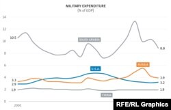 Russia spent almost 4 percent of its GDP on the military in 2018. That's significantly less than Saudi Arabia, which spent almost 9 percent of its GDP on the military in 2018, but more than the United States, China, or any EU country.