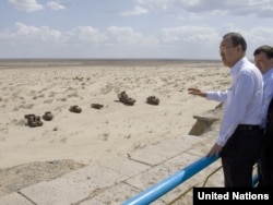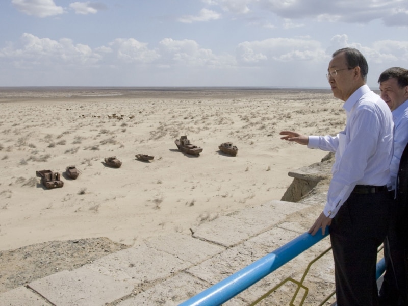 UN chief Ban Ki-moon visits the "ship cemetery" in Muynak, a former port city in Uzbekistan on the Aral Sea, in 2010. Will the Amu Darya suffer a similar fate?