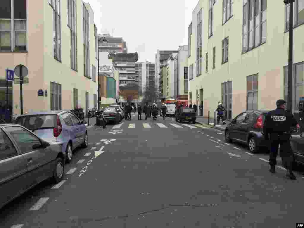 Firefighters and police officers gather in front of the offices of the French satirical newspaper Charlie Hebdo in Paris.