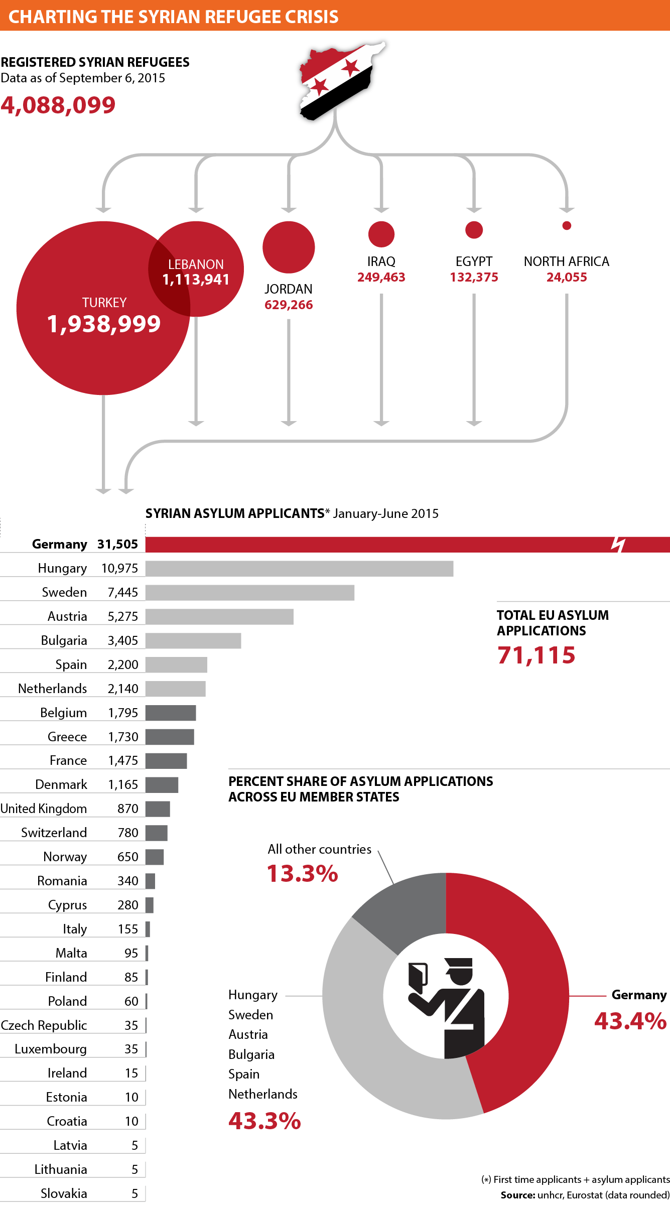 More than 4 million Syrians are registered with the UN’s refugee agency. More Syrians applied for asylum in Germany between January and July this year than in the next top six EU destinations combined.