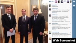 The link (see below) is to a snapshot of an apparent meeting between Russia's Deputy Prime Minister Vladislav Surkov, Prime Minister Dmitry Medvedev, and Kadyrov (from left to right):