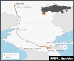 Later that day, the phone contacted cell towers along a railroad line between Grozny and Moscow before going silent. When it resumed contact with its network, the phone had already arrived by train from the city of Voronezh, some 1,000 kilometers to the north -- and with Kobyshev nowhere in sight.