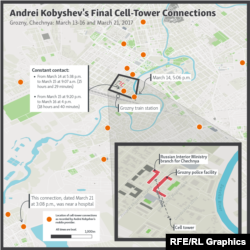 And an investigation by RFE/RL has found that in the days after Kobyshev vanished, his phone was in repeated contact -- including stretches of 15 and 18 consecutive hours -- with a cell tower less than 300 meters from the Grozny police compound where Lapunov claims they were held captive.