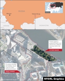 YEKATERINBURG, Russia -- By the time Mayor Aleksandr Vysokinsky arrived at October Square on May 16 to face a crowd of protesters baying for his resignation, the days-long standoff over plans to build a church in an adjacent park had brought dozens of arrests and garnered nationwide attention.