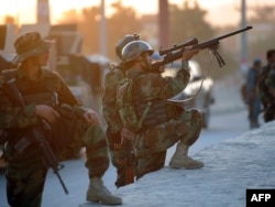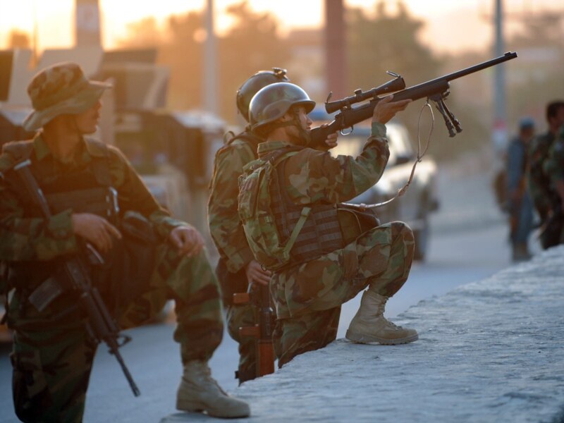 An Afghan soldier aims his gun as he guards the area surrounding the Hotel Inter-Continental during the deadly attack by Taliban insurgents.