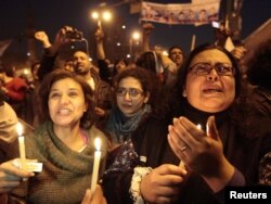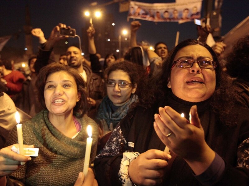 Antigovernment protesters celebrate the announcement of Egyptian President Hosni Mubarak's resignation.