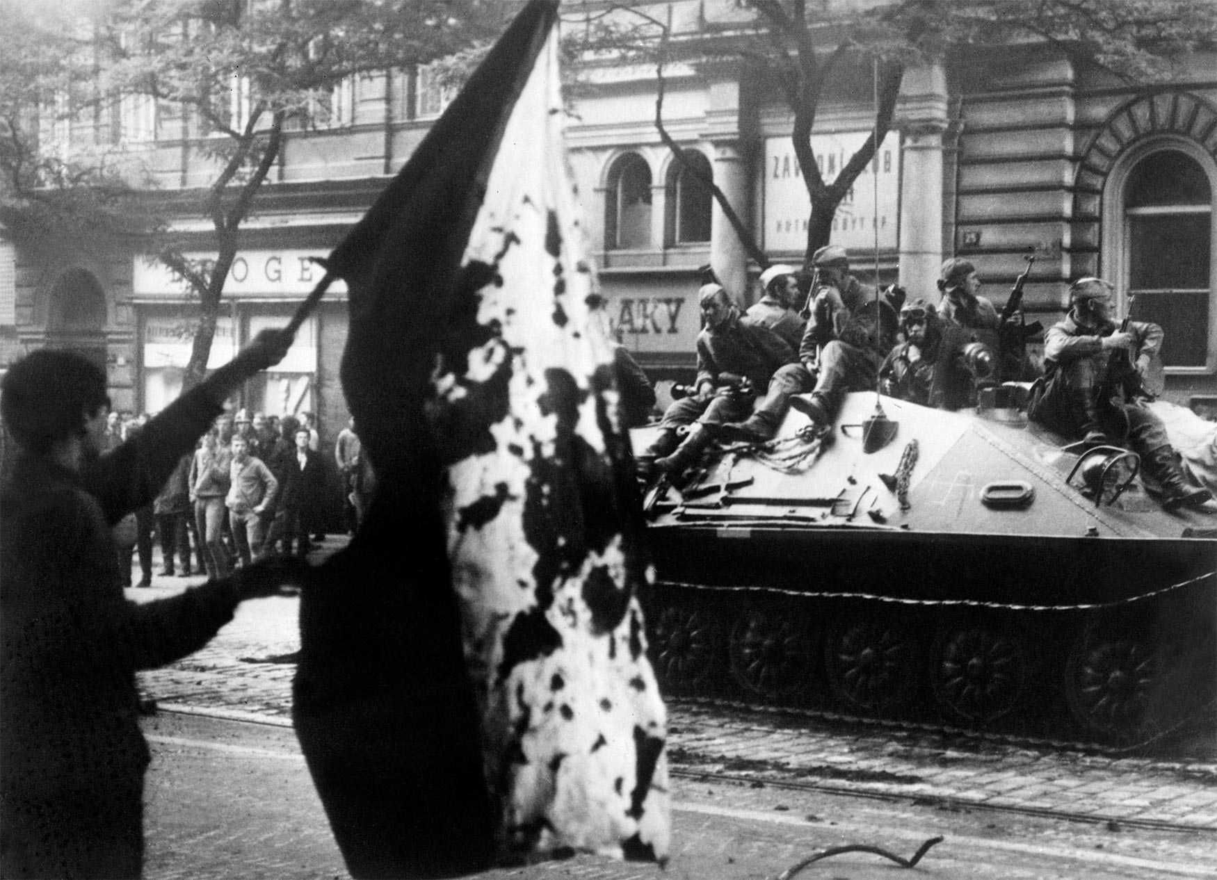 A man waves a blood-spattered Czechoslovak flag as an armored vehicle carries Soviet troops through Prague. AFP
