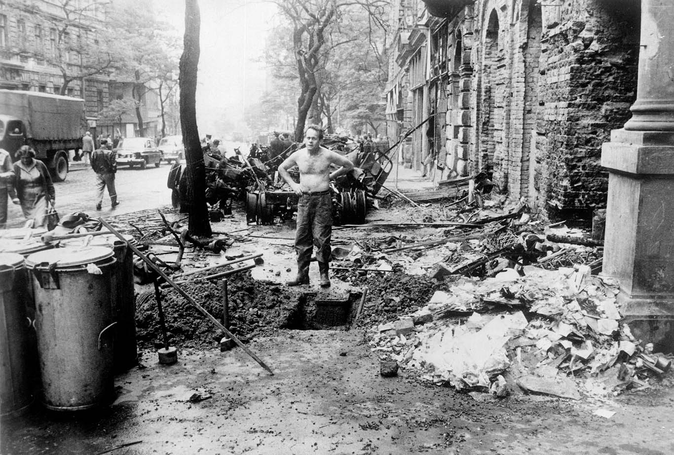 A man surveys damage in Prague on August 31, 10 days after tanks rolled into Czechoslovakia. AFP