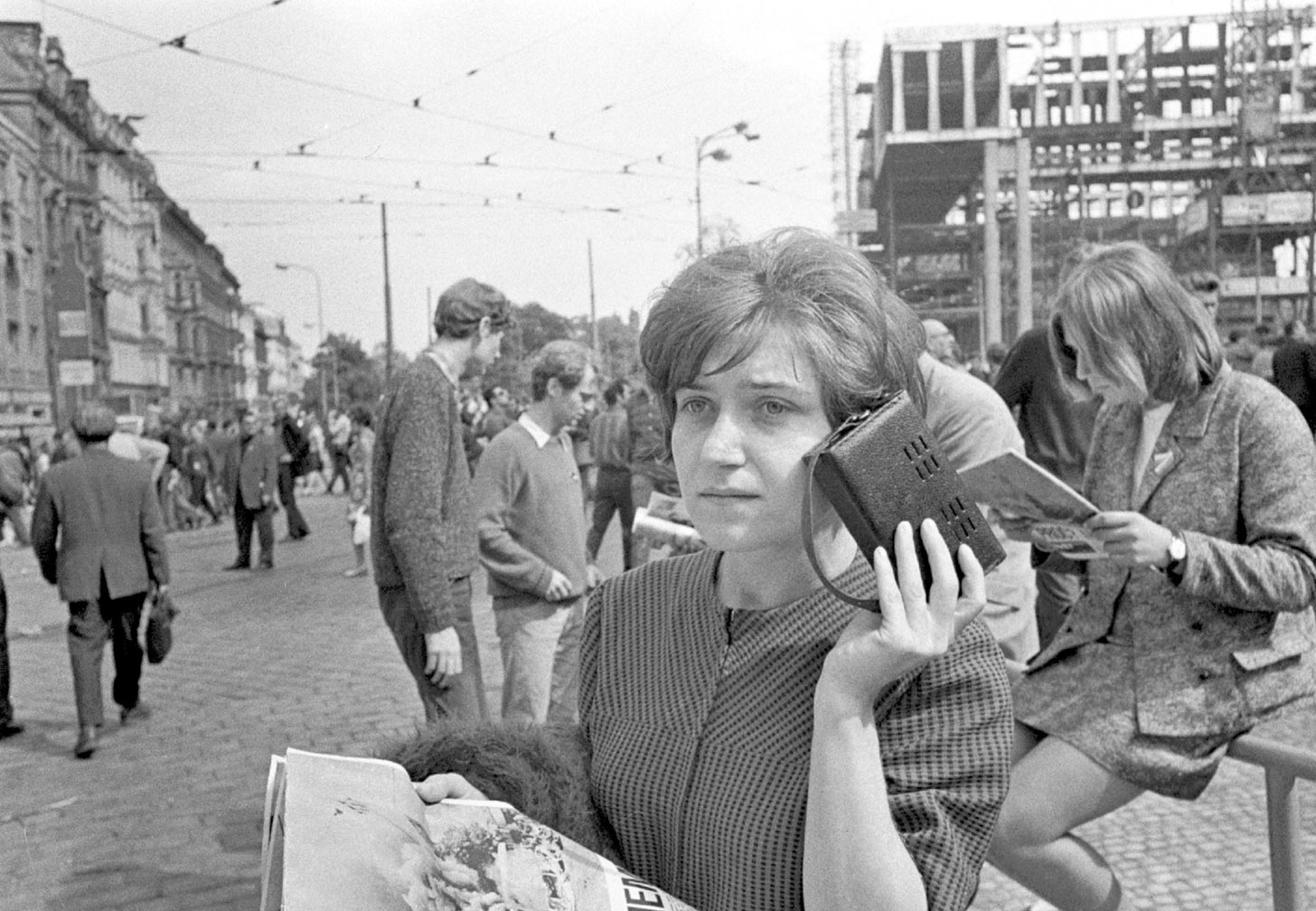 A woman on Prague's Wenceslas Square listens for news amid the invasion and clings to a local paper whose headline asks "Why?" in Czech and Russian. CTK