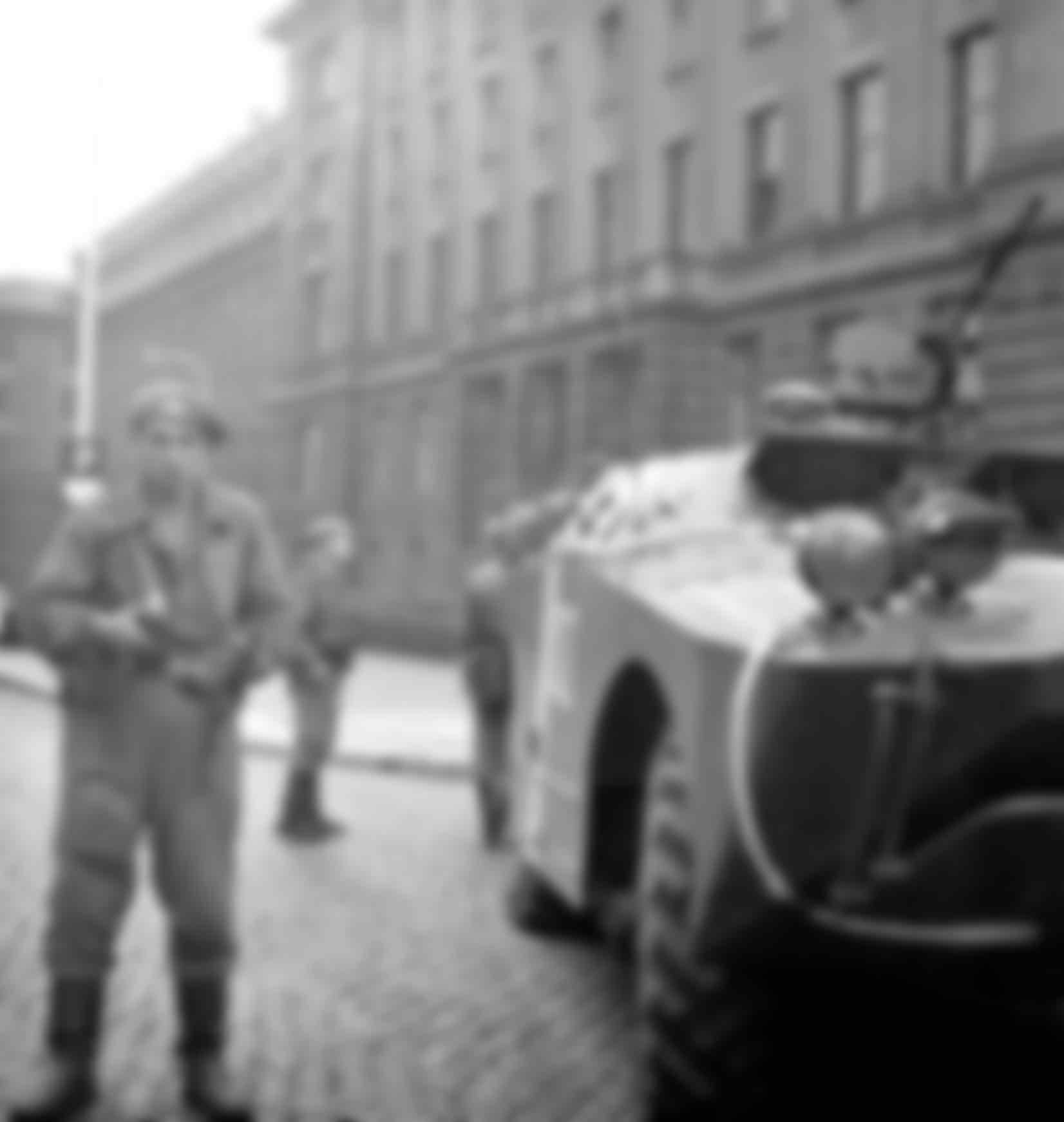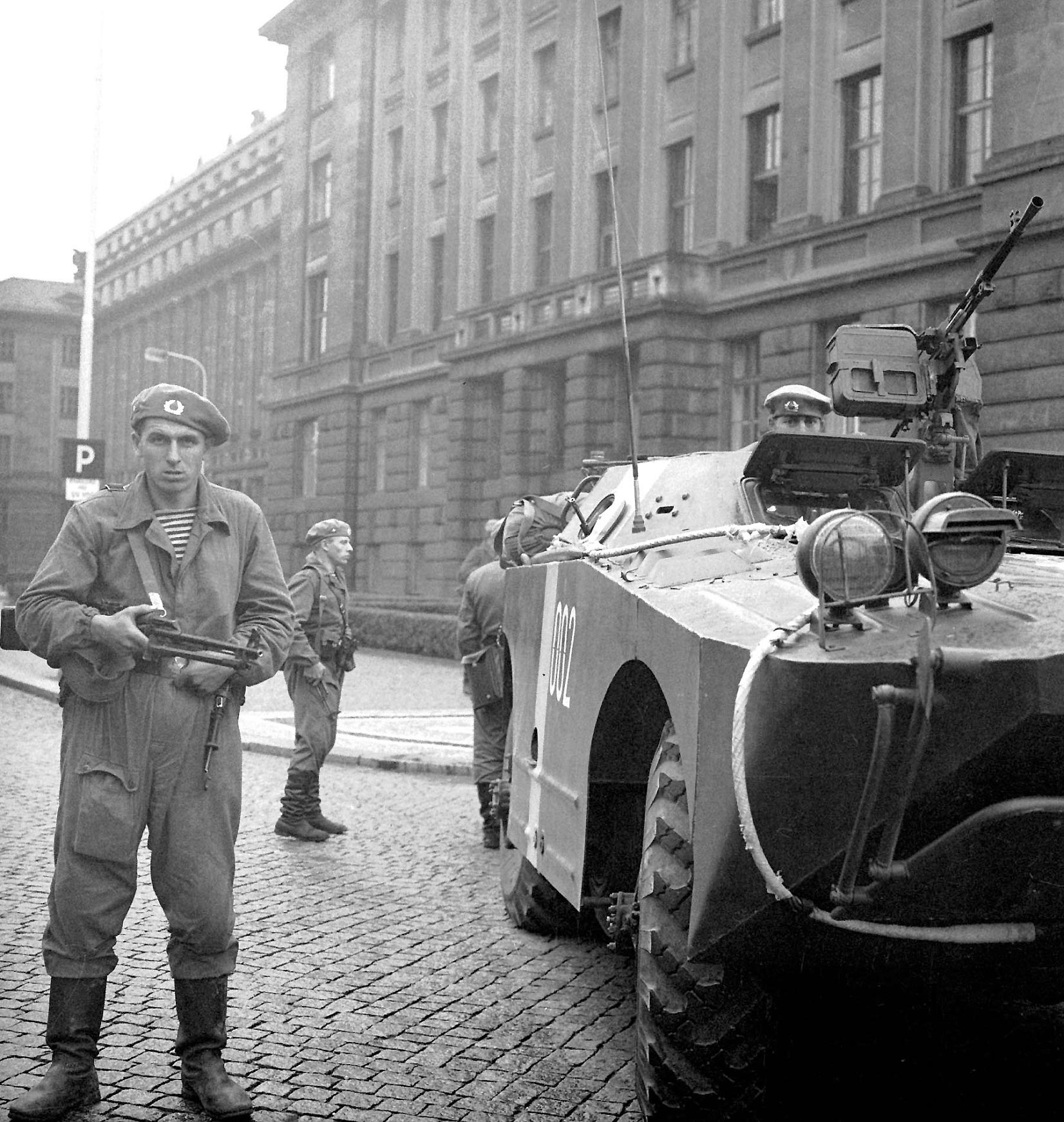 Warsaw Pact troops stand guard outside Communist Party headquarters in downtown Prague on the first day of the invasion. CTK