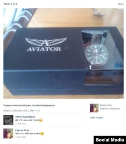 A social-media post made by Usov a day earlier, on February 21, comprises a close-up photograph of a boxed Aviator Airacobra watch with a Defense Ministry logo printed on the watch face. The photograph appeared to remain live on VKontakte almost a year later.