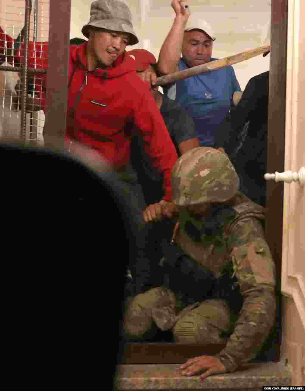 A member of the special-forces team is attacked by Atambaev supporters after surrendering.