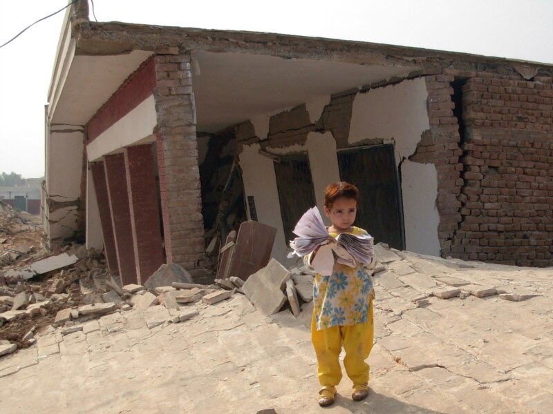 A little girl stands outside the rubble of a school building destroyed by militants on the outskirts of Bara in 2009.