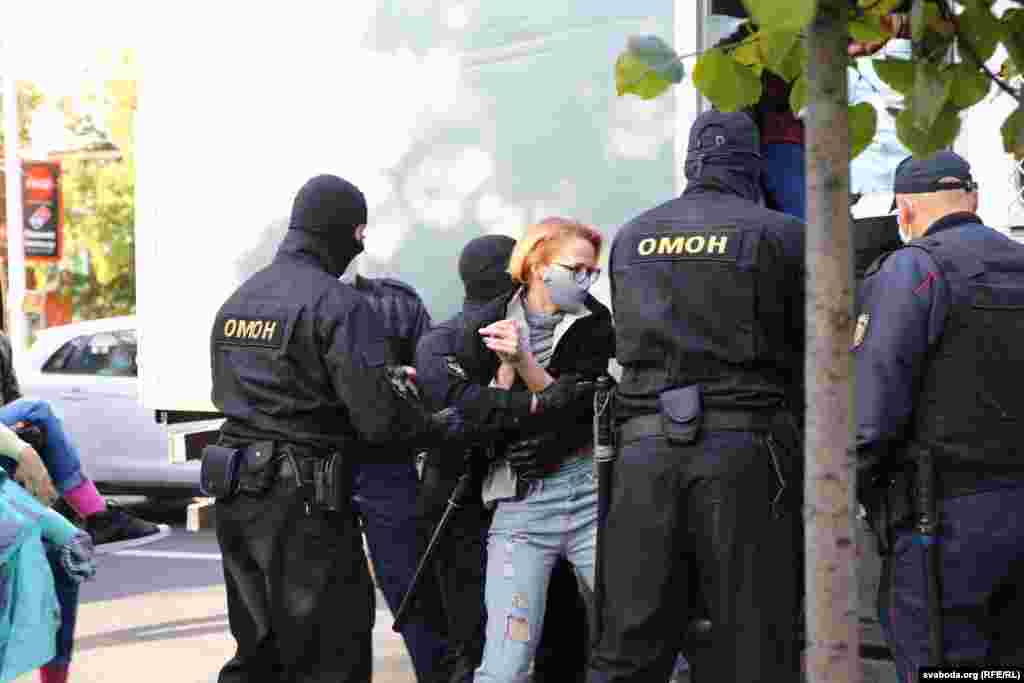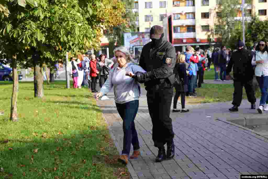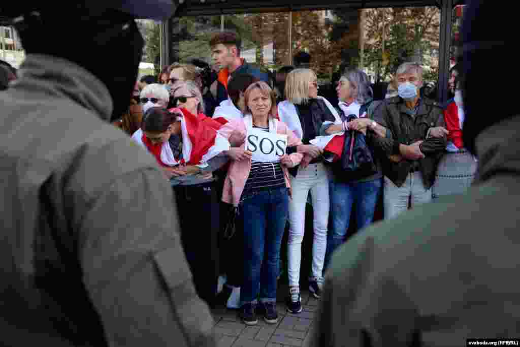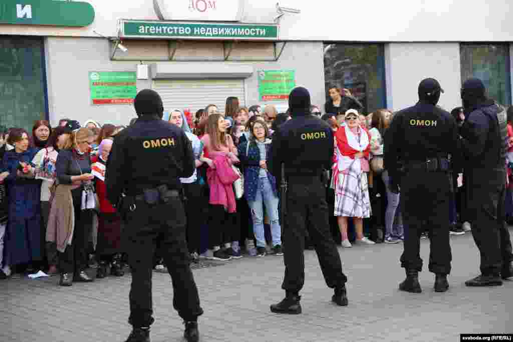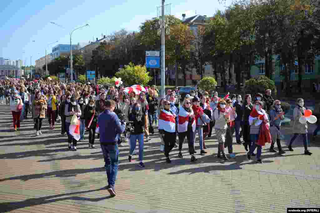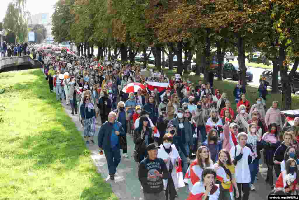 Hundreds of protesters, many of them women, marched in central Minsk on September 19, briefly scuffling with riot police who then blocked their path.
