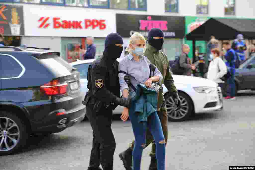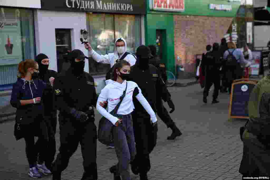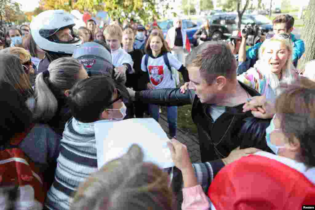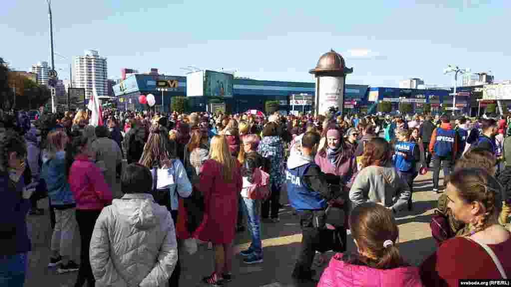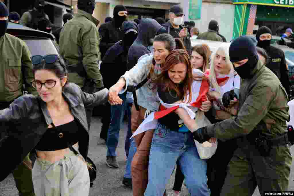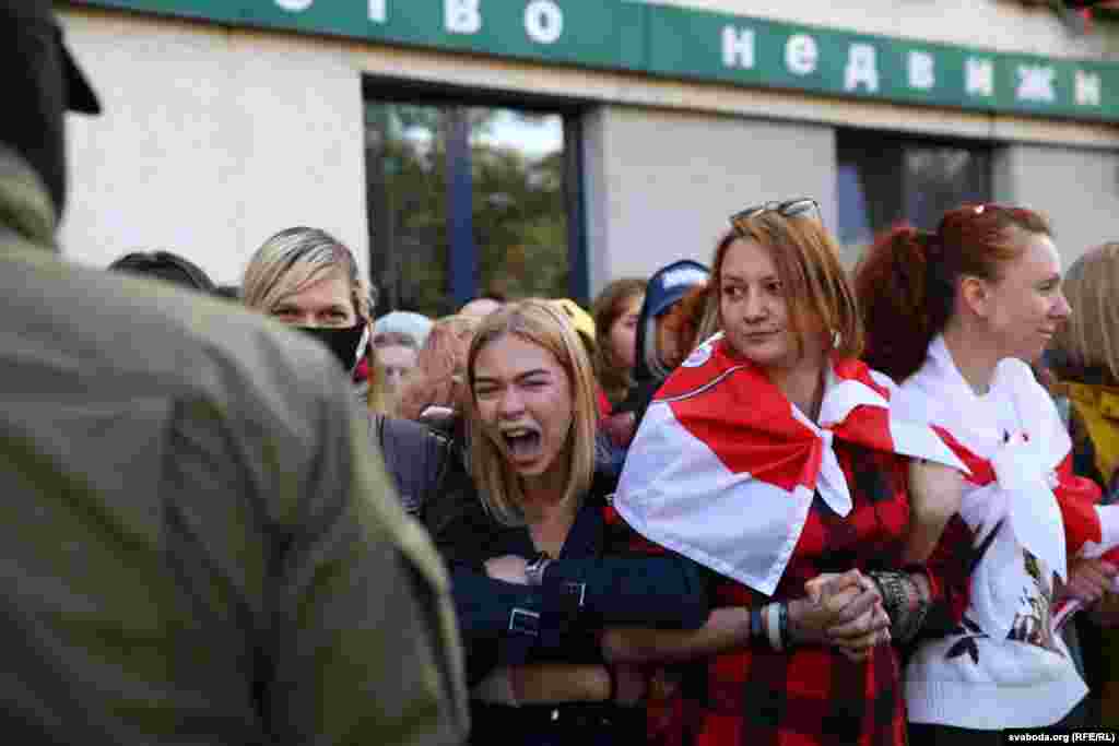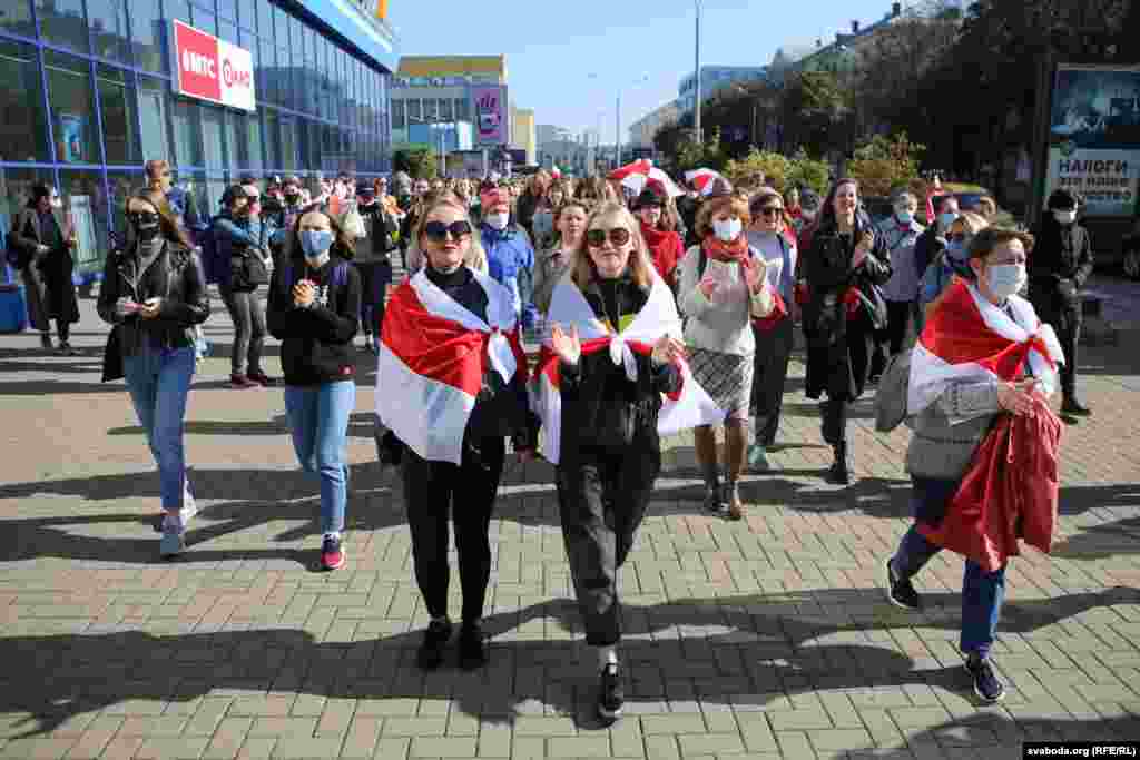 Hundreds of protesters, many of them women, marched in central Minsk on September 19, briefly scuffling with riot police who then blocked their path.