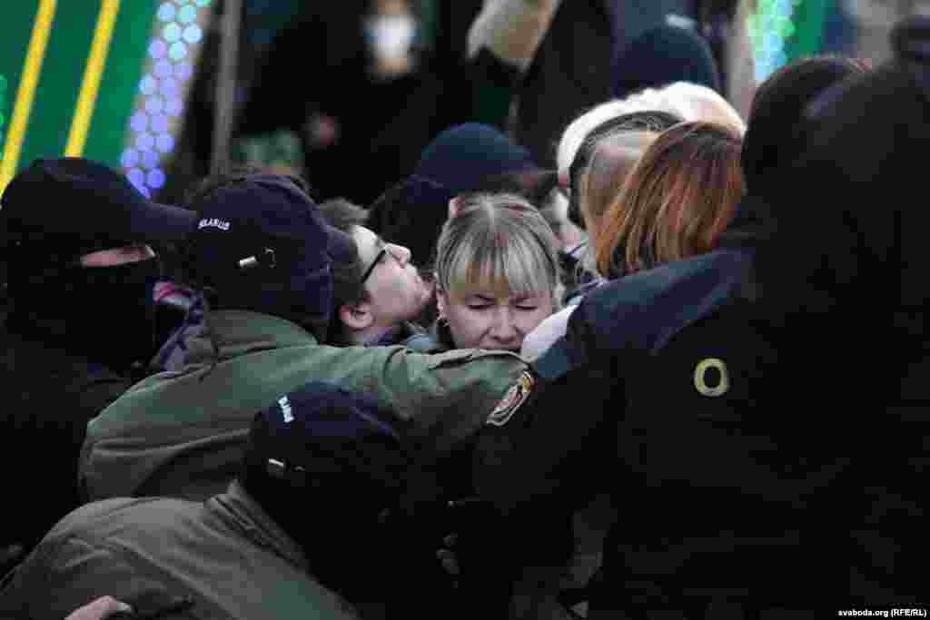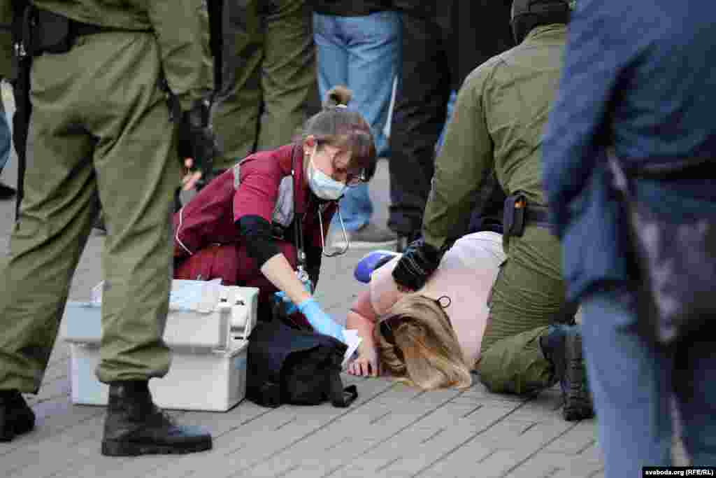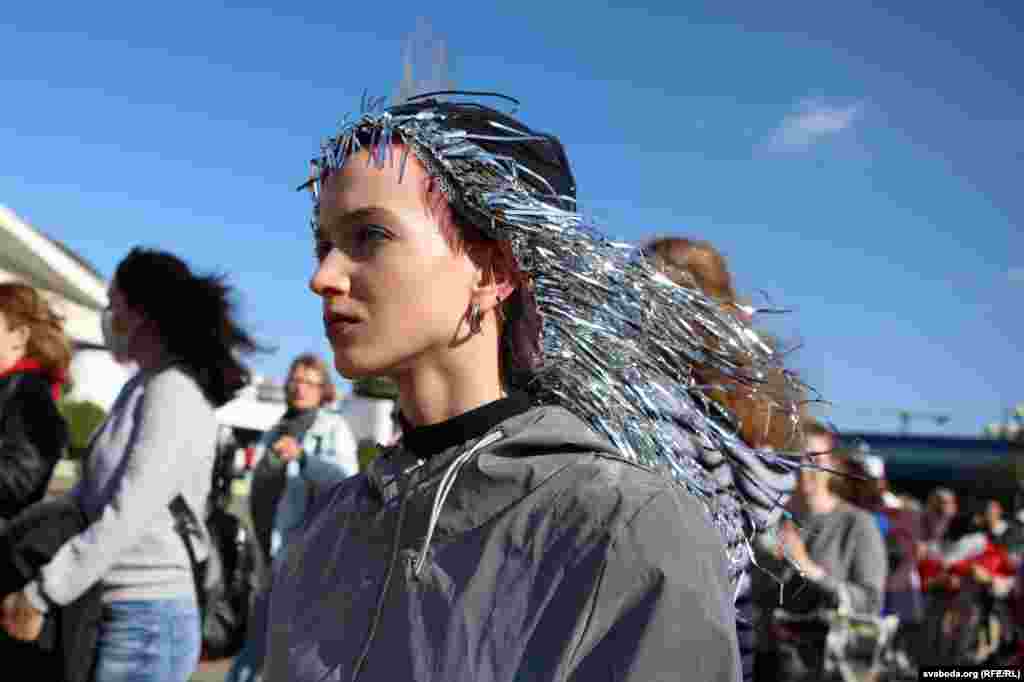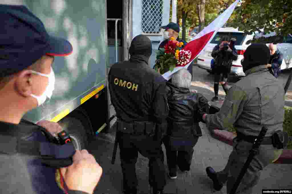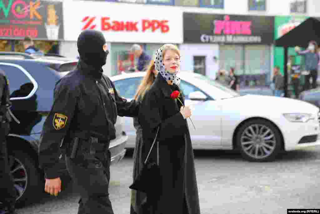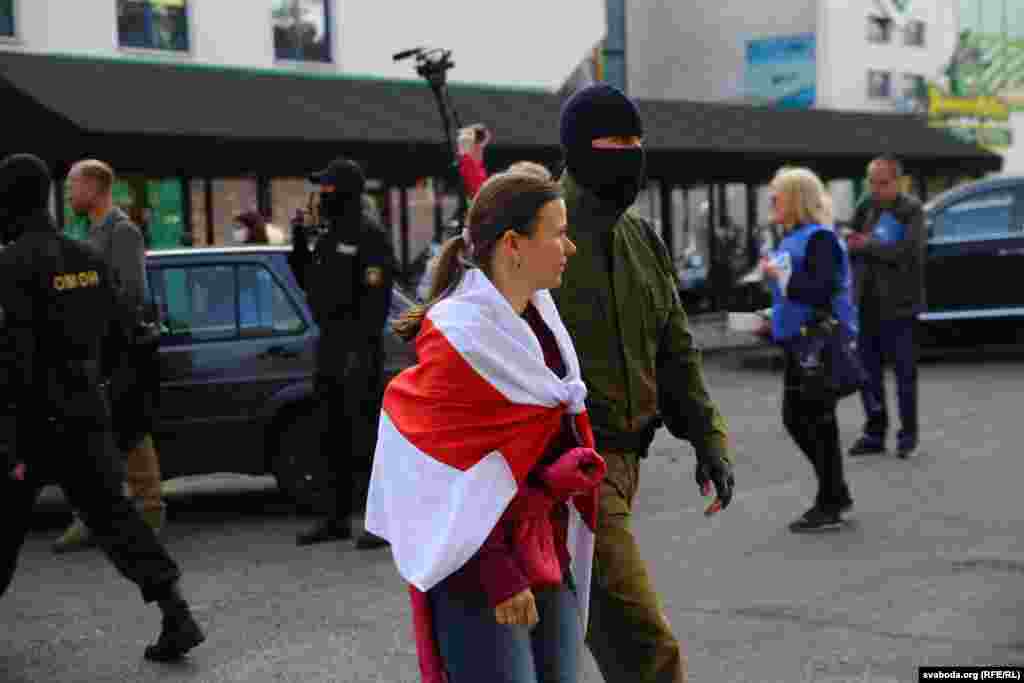 Hundreds of protesters, many of them women, marched in central Minsk on September 19, briefly scuffling with riot police who then blocked their path.