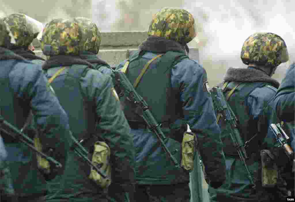 Russian police stand outside the Dubrovka theater in Moscow after Chechen extremists stormed the building and took between 900 and 1,000 people hostage on the evening of October 23, 2002.