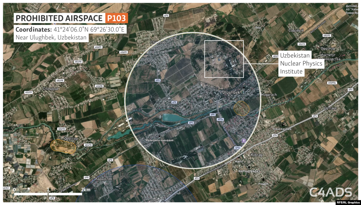 One zone with prohibited airspace does not cover an area known to include one of Mirziyoyev’s residences. But it does include Uzbekistan’s Nuclear Physics Institute.