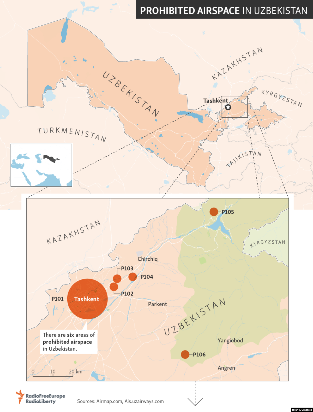 Here’s a look at the six zones that Uzbekistan has designated as prohibited airspace.