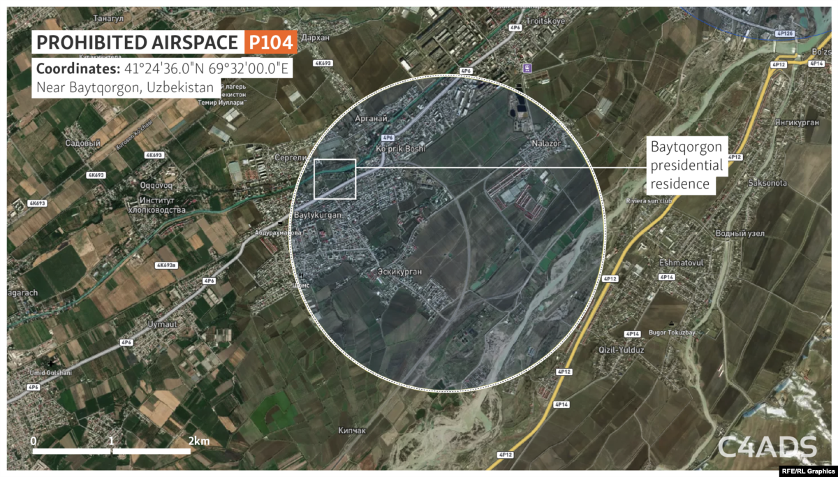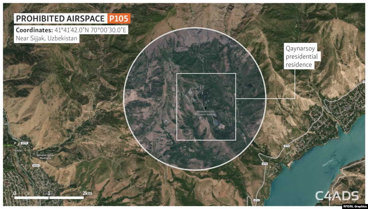 The remote mountain retreat falls within one of six zones in the country that the Uzbek government has designated as prohibited airspace, according to an analysis of airspace-management data and regulations by RFE/RL’s Uzbek Service and C4ADS, a Washington-based nonprofit research group.