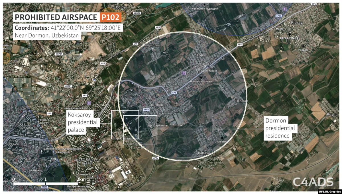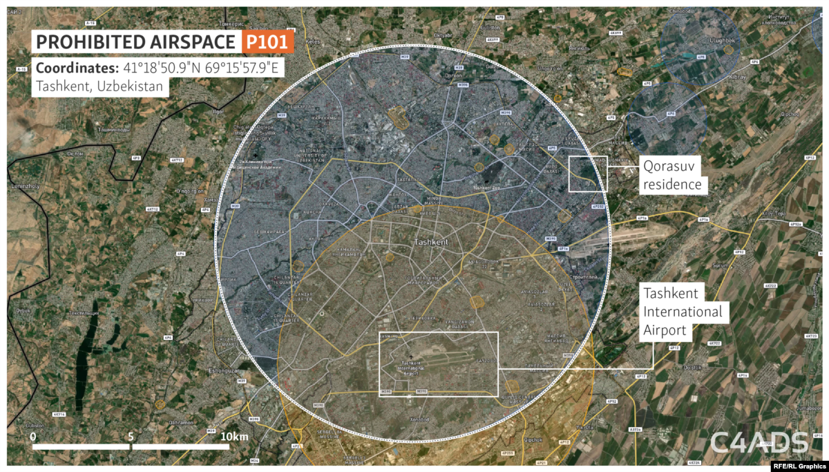 This is the largest prohibited-airspace zone in Uzbekistan, covering almost all of Tashkent with a 10-kilometer radius from the center point -- including most of the territory of Mirziyoev’s Qorasuv residence