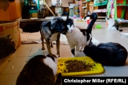 One such dog is named Cyborg, after the nickname given to Ukrainian soldiers who fought Russia-backed separatists for control of the strategic Donetsk airport for 242 grueling days. Cyborg has been slow to open up, and is kept in a pen most of the time. But like the hundreds of other dogs and cats there, he is safe and well-fed.
