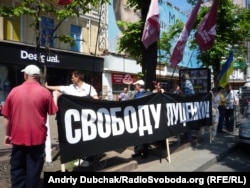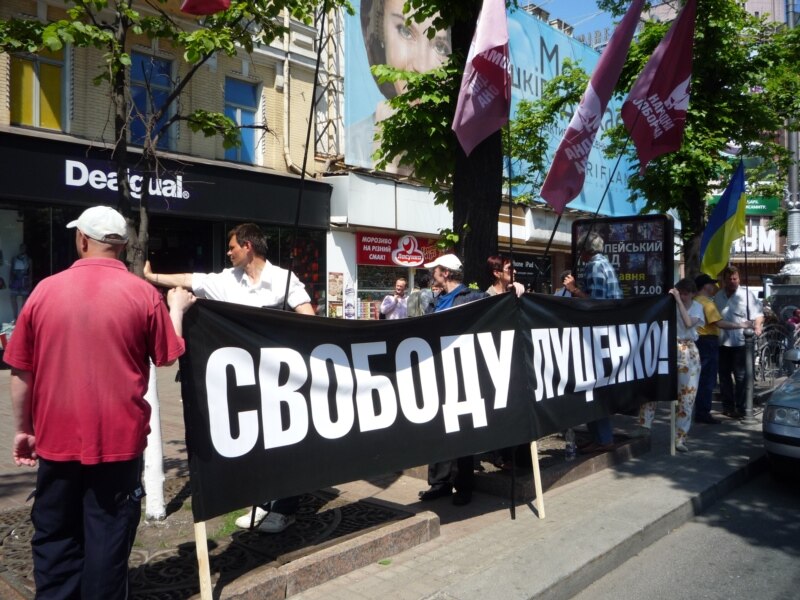 Some 100 activists and supporters gathered in front of the court building on Kyiv's central Khreshchatyk Street today, holding NUNS and opposition Batkivshchyna party banners and placards saying "Liberty for Lutsenko!" and "The prosecutor is democracy's gravedigger!"
