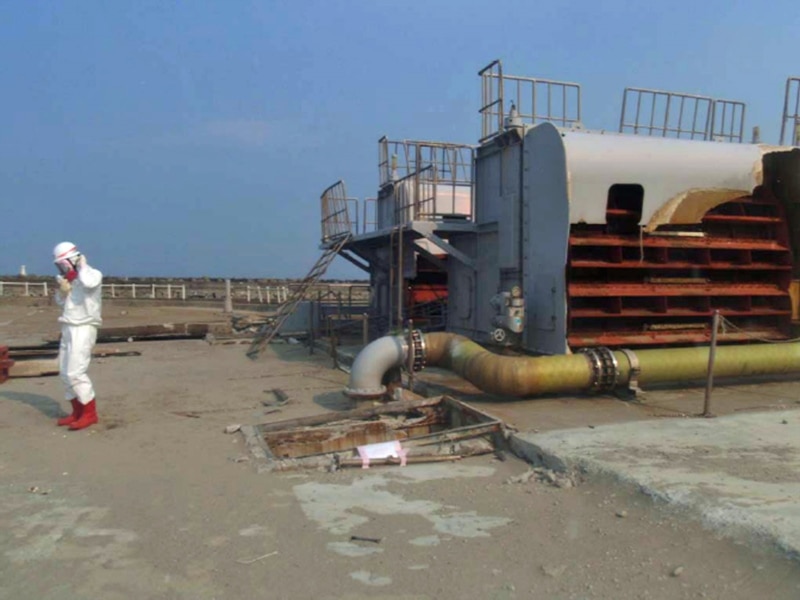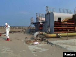 A worker wearing a protective suit walks near the damaged pit at the crippled Fukushima plant's No. 2 reactor.