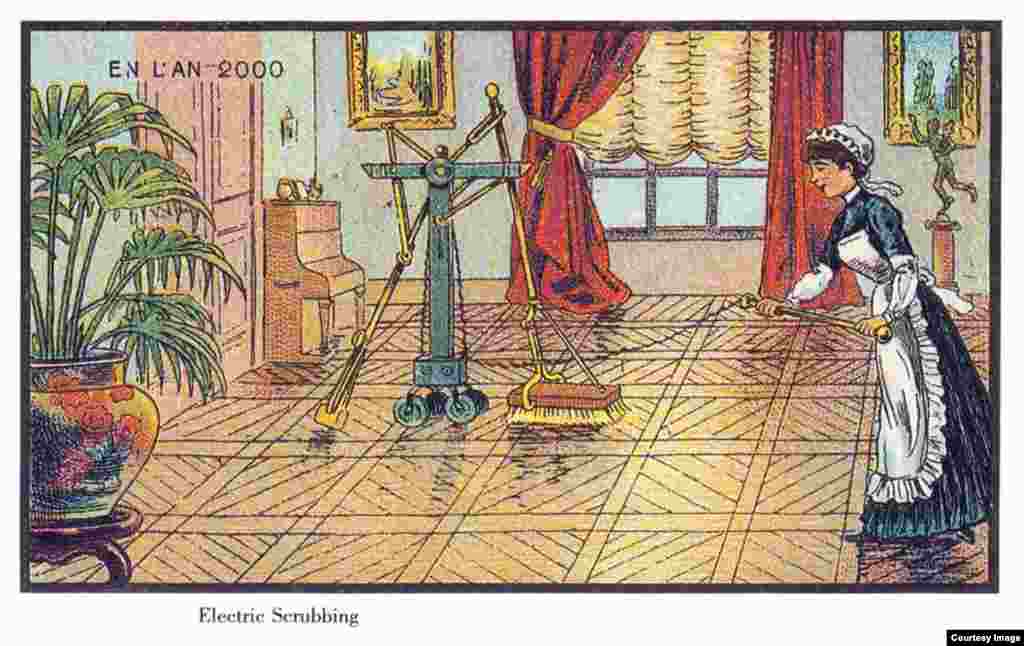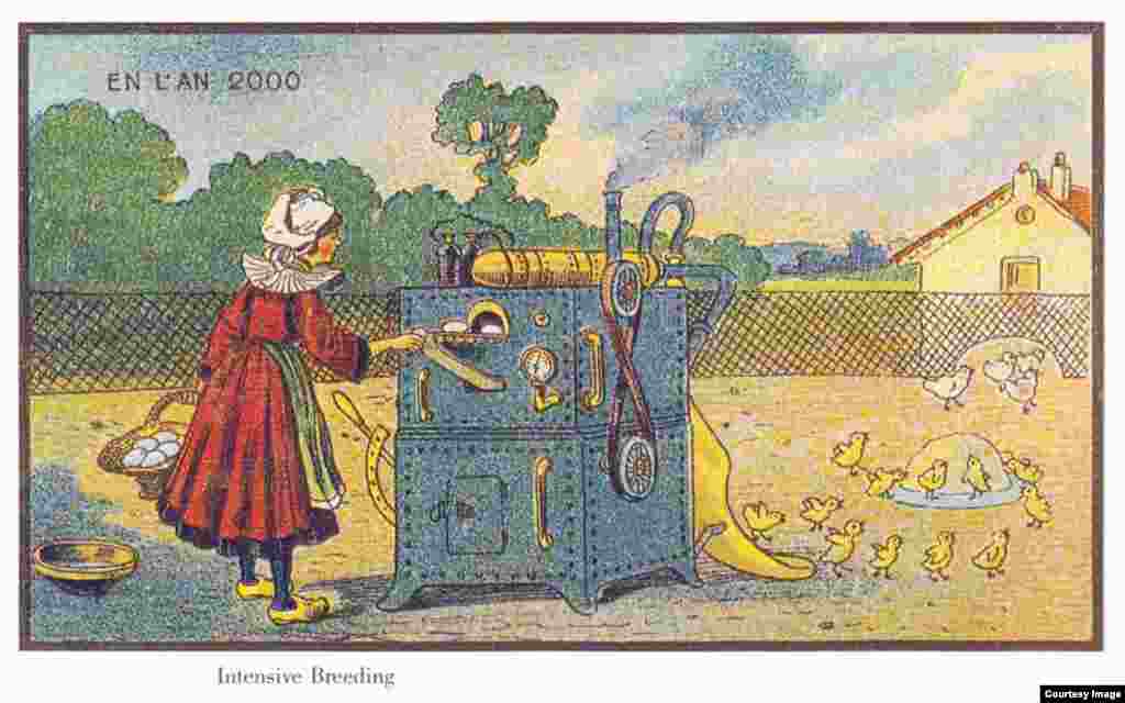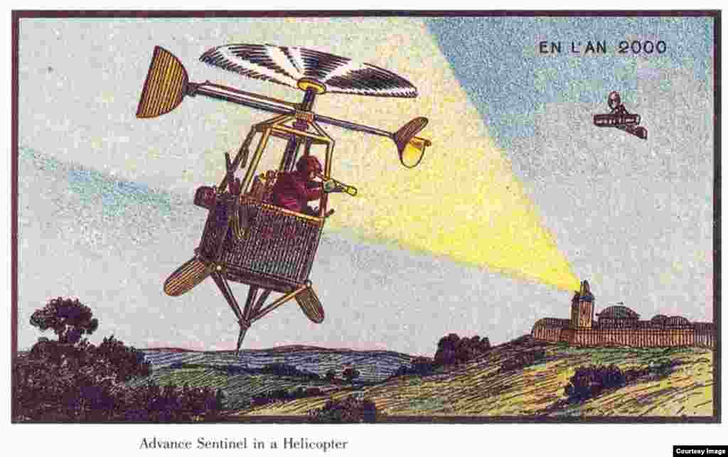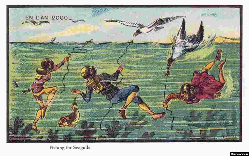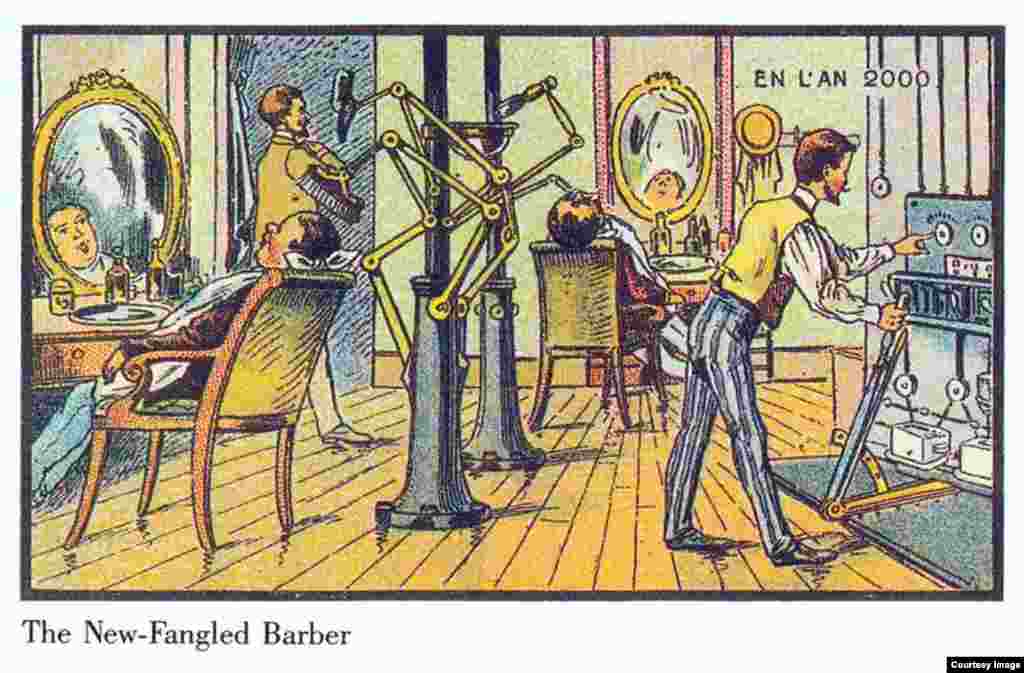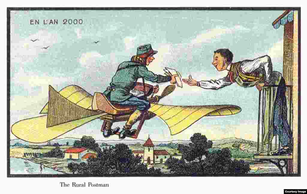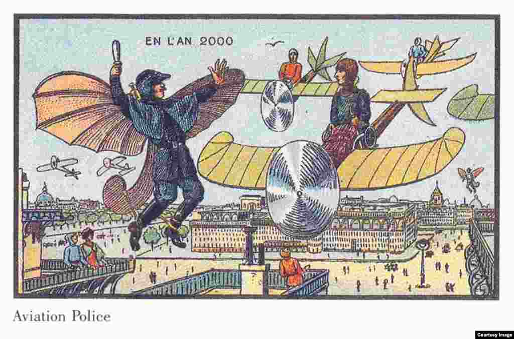 As early as 1899, French artists were imagining the world as it would look in the 21st century. Works by Jean-Marc Cote and other artists were first produced for the World Exposition in Paris, and were later enclosed in cigarette and cigar boxes. The drawings, described by the artists as utopian in view, envisioned everything from mechanized barber shops and flying policemen to diving underwater -- to fish for seagulls flying overhead.