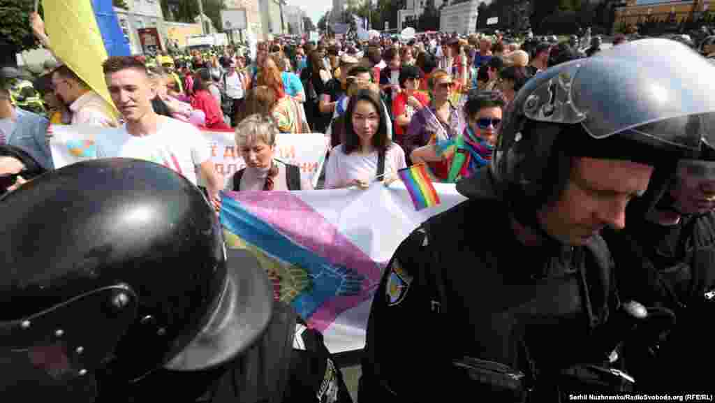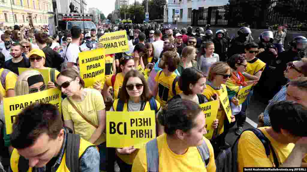 According to police, some 2,500 people gathered for the March of Equality in the center of Kyiv. An estimated 5,500 officers ensured that the event proceeded without disturbance.