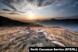Sunset on South Ossetia’s Mount Mtatsminda, or Sacred Mountain. Ruins of a church sit on the peak overlooking the Mejida Valley. A century ago, the area was very populated, but people gradually left as the region declined.