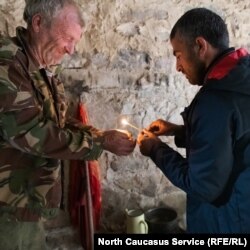 Givi and our Ossetian guide, Renat, light candles inside the church.