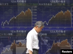 A man walks past a screen showing graphs of the stock indexes of Dow Jones Industrial Average, Nasdaq, Hang Seng, and Shanghai outside a brokerage in Tokyo on June 16.