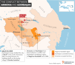 At least 16 Azerbaijanis and Armenians have died in the fighting near a northern section of their internationally recognized border that has included heavy artillery, tank, and drone attacks since it began on July 12.