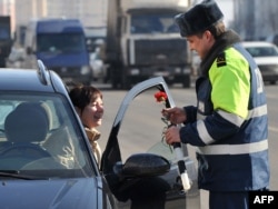 A traffic police officer presents flowers to a woman in her car in the Belarusian capital, Minsk, on March 4 to mark International Women's Day.