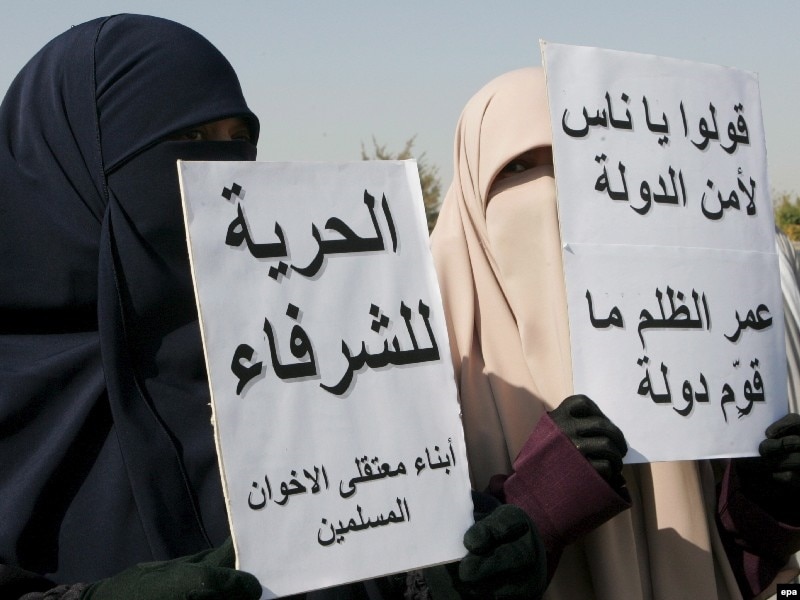 An Egyptian woman holds up a sign saying "Freedom for the honest people" at a Muslim Brotherhood protest outside a court in Cairo in 2007.