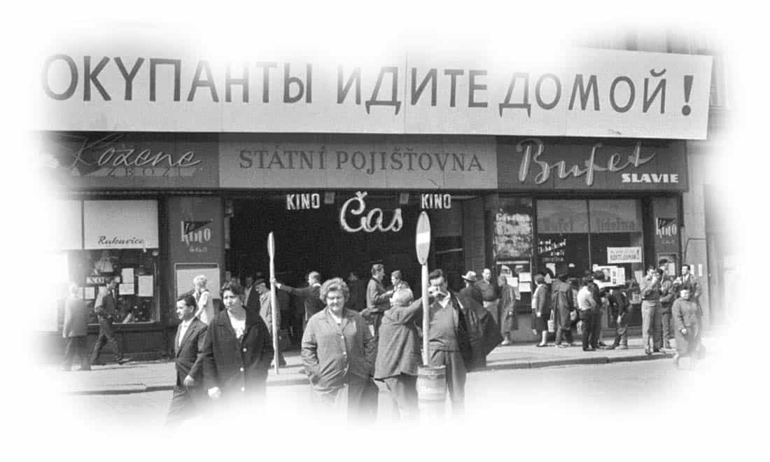 The banner 'Occupiers Go Home!' in Russian in Plzen, Czechoslovakia. (CTK)
