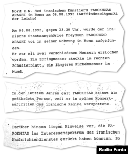 Whoever killed him "apparently had been invited into his apartment for a meal," a 1993 report by Germany's federal criminal police (BKA) that Radio Farda obtained states, adding: "The table was set for two people."